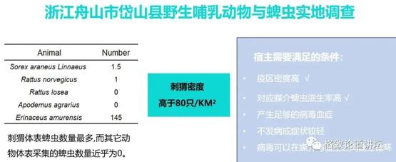 为了进一步证实,我们计算了它的密度。刺猬在舟山岱山岛密度很高,可以到80只/平方千米以上,另外它体表的蜱虫很多,平均每个有145个蜱虫。而其他动物像什么老鼠、鼩鼱,有的有一个,有的压根儿就没有。后来我们在全国其他疫区也做了调查,基本刺猬的密度都是大于100只/平方千米。这就满足了宿主的前两个条件。