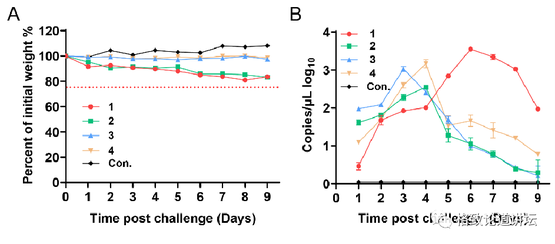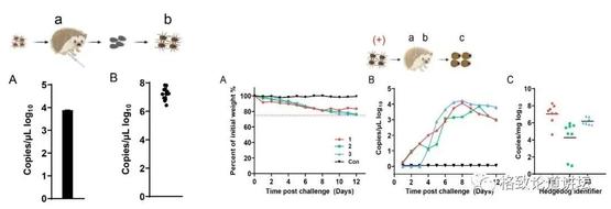那我们就做下一个实验,看刺猬能不能产生病毒血症,血里面有没有病毒。我们通过腹腔注射或者皮下注射给刺猬接上毒,发现它的体重并没有什么下降,但是它的血里产生了很多这个病毒。