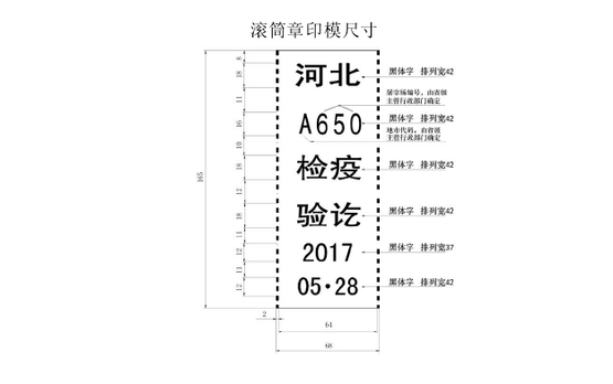 检疫印章为滚筒式,一般从猪的臀部滚到肩胛部位,印章滚动一周后会在猪身上出现六行字迹。包含省份、印章编码、“检疫”、“验讫”、年份、月份和日期信息[7]。