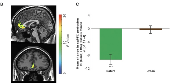 反刍思维减少,与反刍思维相关的膝下前额叶皮质 (sgPFC) 活动降低,而城市环境散步则没有发现这类影响。[7]