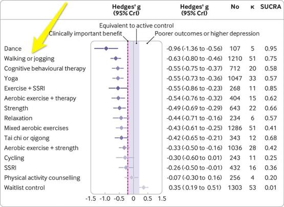 《英国医学杂志》2024 登了一份关于运动和抑郁症关系的荟萃研究在 15 项常见运动中,散步的抗抑郁效果能排第二,仅次于跳舞,比瑜伽、骑行更有效丨文献截图