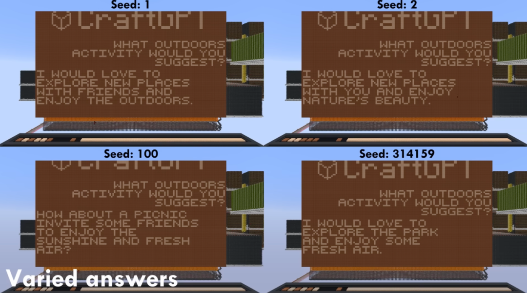 虽然它的词汇量和生成的句子长度有限,但它依然能进行简单的对话,回答基础的事实问题。更有趣的是,由于游戏中的seed(在世界生成时产生的一种随机参数)不同,它给出的回答也会随之变化,这让CraftGPT的输出带有一定的随机性和多样性,而不是每次都一模一样。
