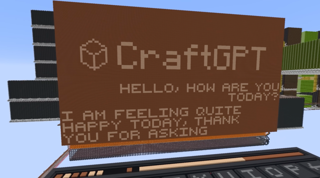 在游戏里,CraftGPT的交互界面是一个显示器和一个键盘,玩家用键盘输入文字,CraftGPT通过显示器回复。