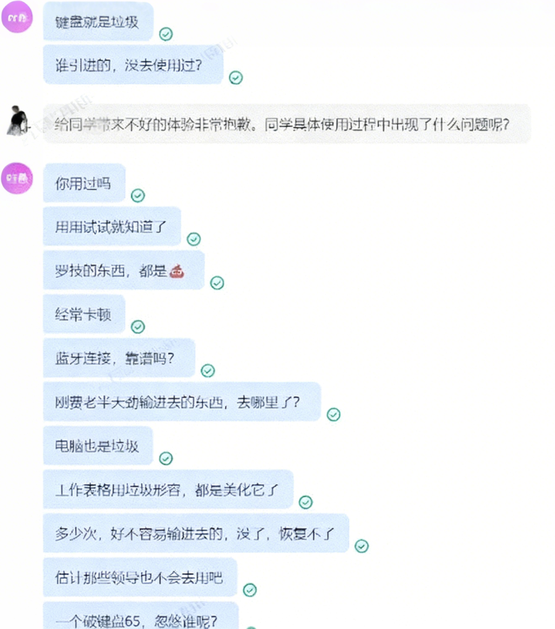 正好这两天IT发了个意见表,让我评价新设备的使用情况,我生气地给键盘打了个“非常不满意”。结果到晚上有IT那边的人加我联系方式,问我对键盘具体哪里不满意?我像只怒吼的狮子一般,大声咆哮了起来。