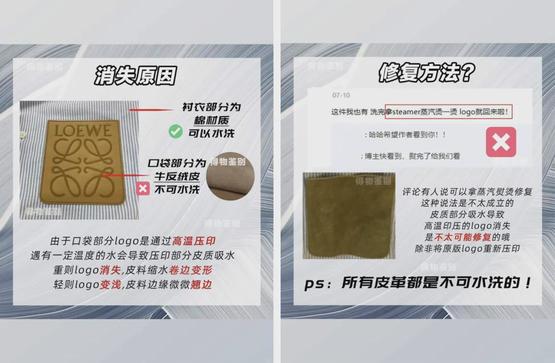 除了制作工艺,面料是另一个重要变量。2022年有网友发帖吐槽自己新买的罗意威衬衫洗了一次胸前的logo就整个消失,“六千的衬衫秒变60”。得物出来科普说logo高温压印在牛反绒皮材质的口袋上,而牛反绒皮不可水洗,皮料吸水会变形,高温印压的logo一旦消失,就很难修复了。所以,为了保住这片logo,如果是单独清理需要用绒面刷或者干净的棉布蘸取清洗剂,整体清洗需要干洗。
