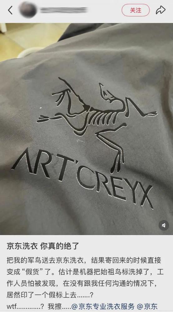 前段时间,有网友发帖吐槽,说把一件“军鸟”(始祖鸟军用产品线)送到京东洗衣,结果洗完寄回来,喜提“假货”——品牌名Arc'teryx变成了Art'creyx。字母还是那些字母,但排列组合出了新的Art。