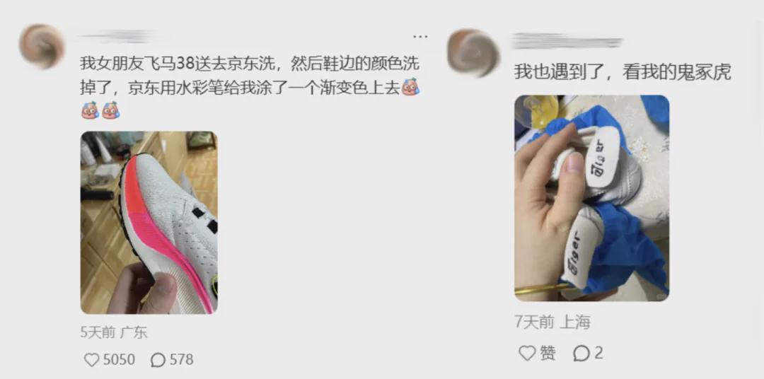 而这竟然不是孤例。一只始祖鸟缺胳膊少腿的经历发出来,就如同向社交平台这片无奇不有的大池塘里扔了一块鹅卵石,激起应和无数:我的耐克勾勾被洗掉了,洗衣店自己画了一个勾;我衣服印花被洗掉色了,洗衣店重新涂了颜色送回来;我鞋上的logo被洗掉了,洗衣店给我贴了个“fashion”。
