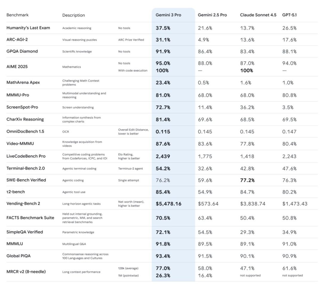 我不是针对谁,我是说在座的各位……Gemini 3 Pro 晒出成绩单,它不仅完全把前辈 Gemini 2.5 Pro 拍死在沙滩上,还在除“解决真实 GitHub 问题(SWE-Bench Verified)”这一项之外,全面碾压了 Claude Sonnet 4.5 和 GPT-5.1。