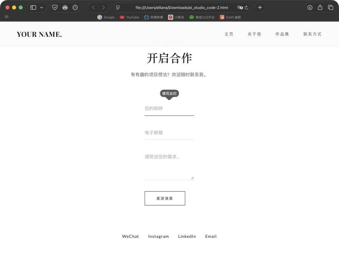 我自己也实际测了一番。我让 Gemini 帮我做了个个人网站,要求是有四个页面,分别是主页、个人介绍、作品、联系方式。风格要现代简约,高端大气。