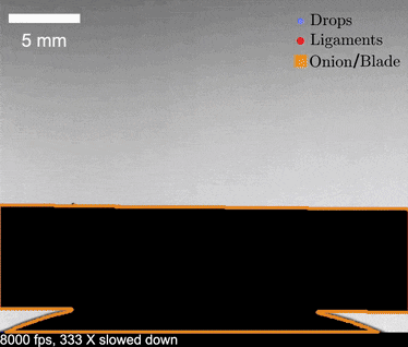 为了看清切洋葱过程中究竟发生了什么,研究团队决定用高速摄像机捕捉洋葱的每一个飞溅瞬间。他们为洋葱设计了一款“断头台”,让刀片自由下落切割洋葱。同时,他们还编写了一种算法,逐帧追踪这些微小液滴的运动轨迹。