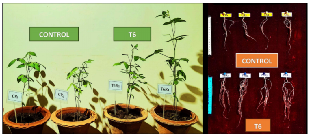与对照组(control)相比,每天倾听85±5 分贝的灵修音乐组(T6)绿豆的茎和根长度显著较高|参考文献[10]