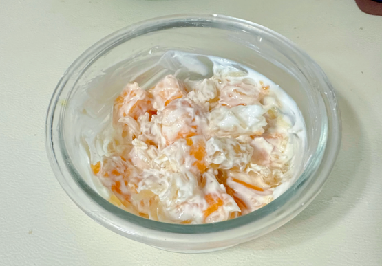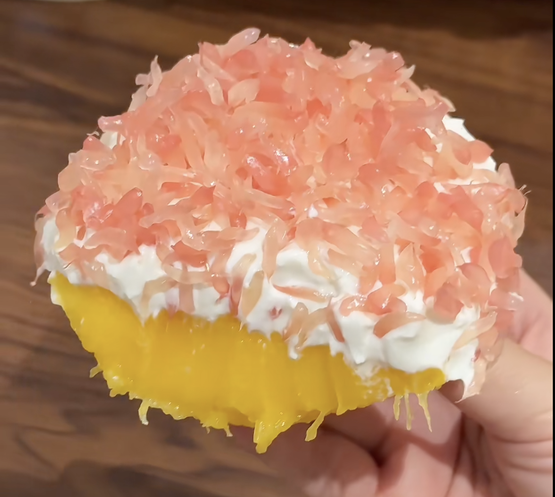 固体杨枝甘露配料只有酸奶+水果“固体杨枝甘露”制作教程非常简单:半个新鲜芒果的厚果肉打底,抹上一层干噎/希腊酸奶 + 椰浆粉(可以不加),再撒上剥好的一瓣红柚果粒,就做好了。