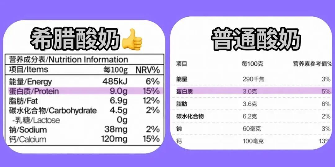 经过浓缩的希腊酸奶,优质蛋白含量通常都会飙升到普通酸奶的好几倍,补充效率大大提升。