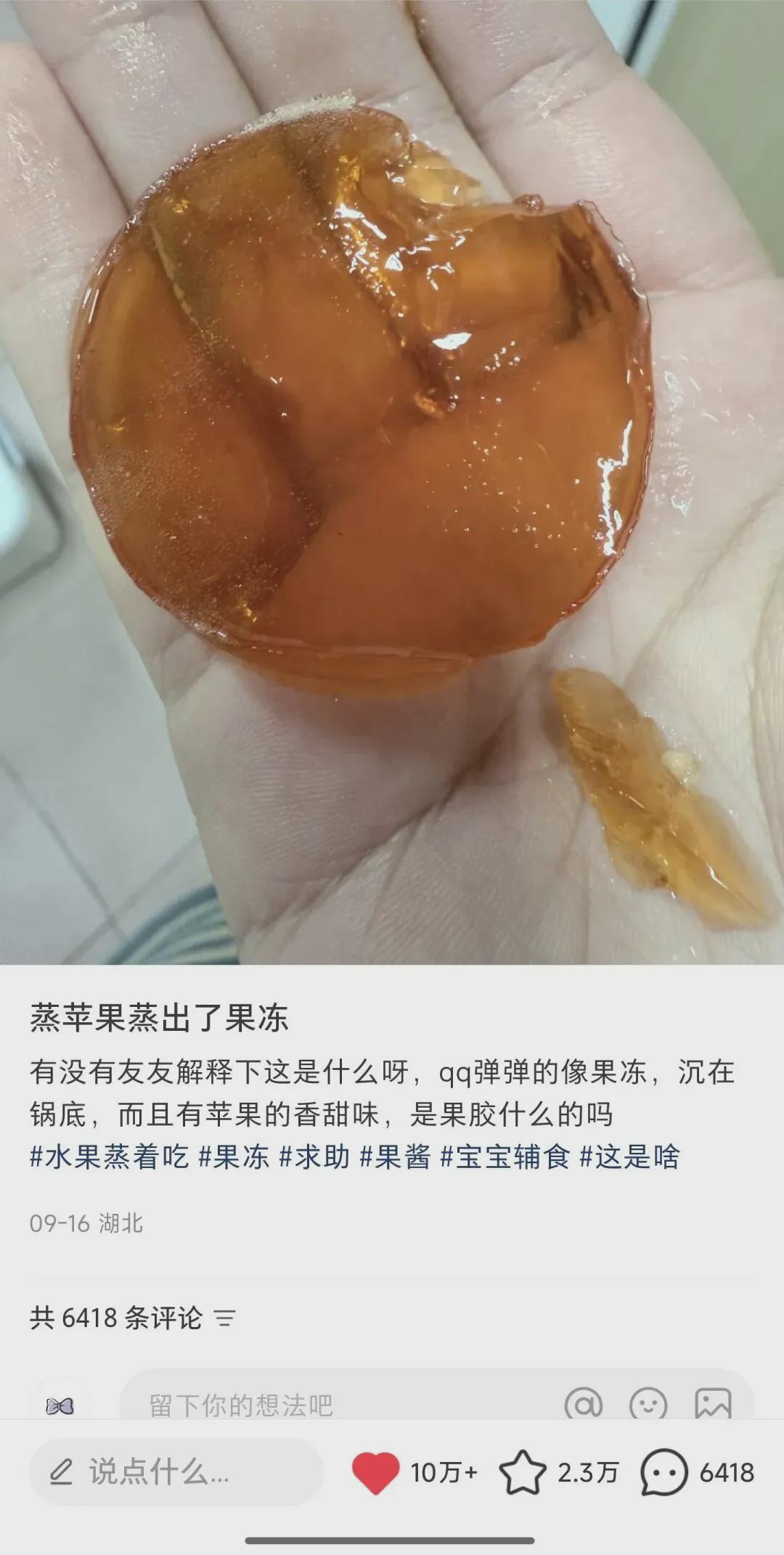 许多网友纷纷晒出自己蒸苹果后,锅底出现晶莹剔透、状如果冻的物质,并好奇地发问:这到底是什么?能吃吗?是不是苹果坏了?