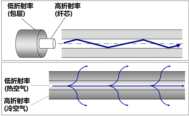 图5:光在光纤中的传播(上)与激光武器的激光束在空气中传播产生的“热晕效应”(下):前者使光的能量保持在纤芯内,后者相反作用促使光束更加向四周发散丨作者绘制