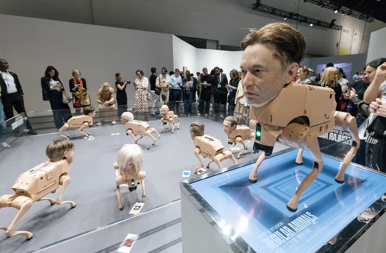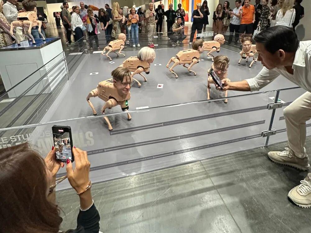 当地时间12月4日,迈阿密巴塞尔艺术展(Art Basel Miami Beach)的数字艺术单元Zero 10展区中,观众最多的展品不是某位艺术大师挂在墙上的画作,而是围栏里一群顶着人脸、会随地“大便”的机器狗。