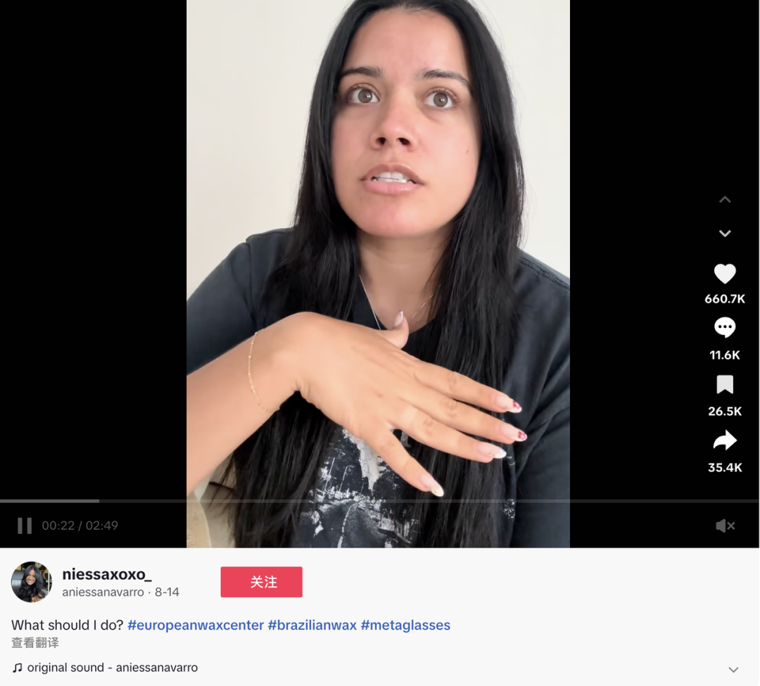 被注视者分辨不出。9 月,一位名叫 Navarro 的 TikToker 网红在去做蜜蜡脱毛时,她注意到美容师一直佩戴者 Meta 眼镜给她服务,整场过程她都感到极度不安,脑海中反复盘旋着“她是不是在拍我?”的念头。