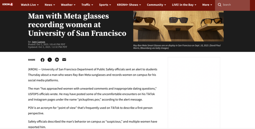 就在几周前,旧金山大学发布了一则校内警告:一名男子使用 Meta 智能眼镜在校园偷拍女性,并将视频上传至“PUA 类”社交账号。