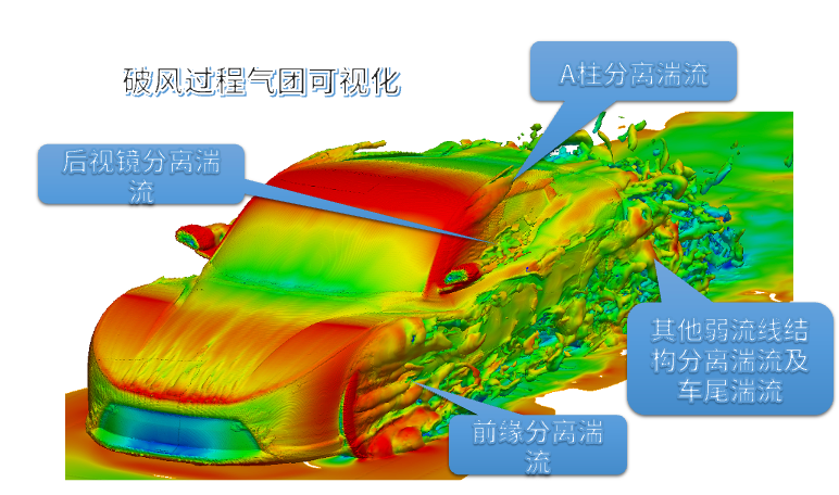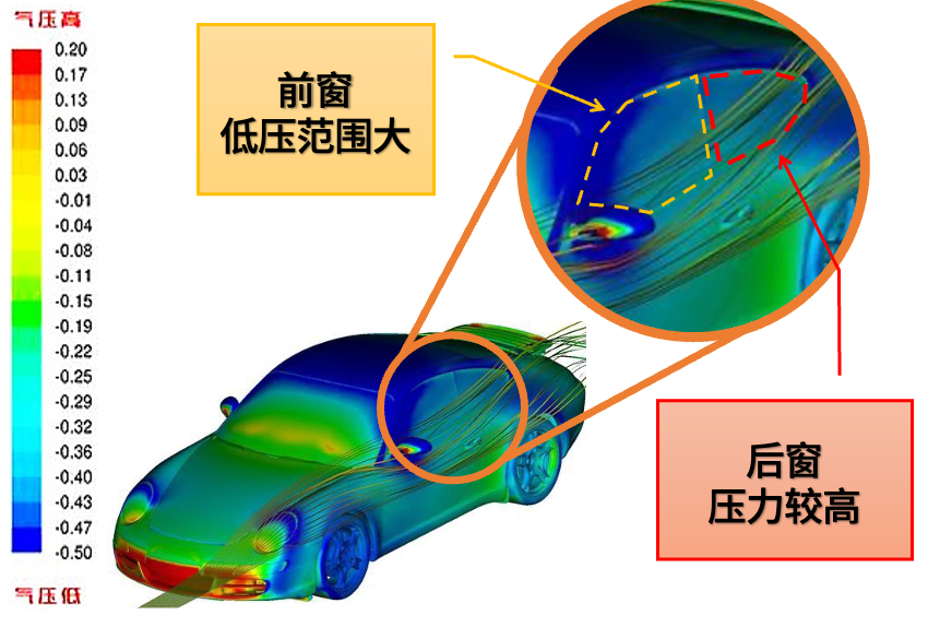 通过仿真,我们得到了车身外表面压力分布:红为高压,蓝为低压。高压区驱动外部空气进入车内(气流入口),低压区则抽吸车内空气排出(气流出口)。