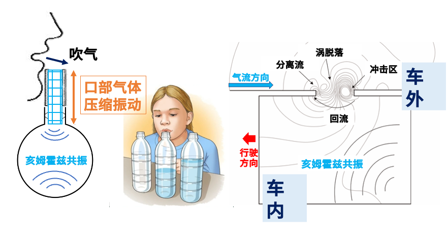 有一类噪音像“嗡嗡”,音调固定,来去突然,多出现在单窗半开、车速中等的时候。这是共鸣噪声。这时“车窗—车厢”构成类似“瓶口—腔体”的结构,开口处气体不断压缩、反弹,形成的振动频率与腔室固频一致,进而产生亥姆霍兹共振,放大了噪音。这也是乐器共鸣腔的工作原理。最简单的止“嗡”方法就是再开一个开口,让压力有路径泄出去,让这套“瓶口+瓶身”不同频,无法共振。微开天窗常常立竿见影。当然也会有“多口”共鸣,简单改变一下窗口大小即可。