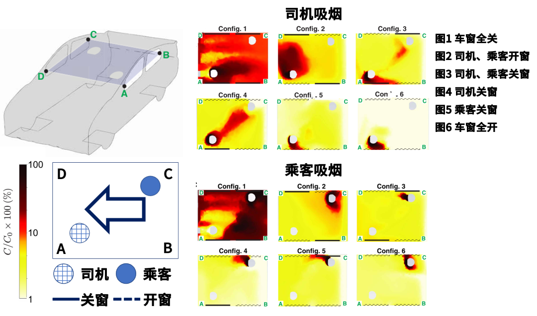 四窗全开时舱内残留最低,快速换气效果最好(图6颜色最浅)。前排吸烟时,只要前窗参与排气,绝大部分烟都能被迅速带走(见图2、图5);相反,吸烟一侧若关窗,其他座位的浓度会明显上升(见图3、图4)。