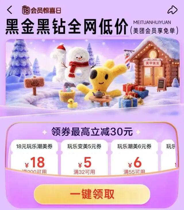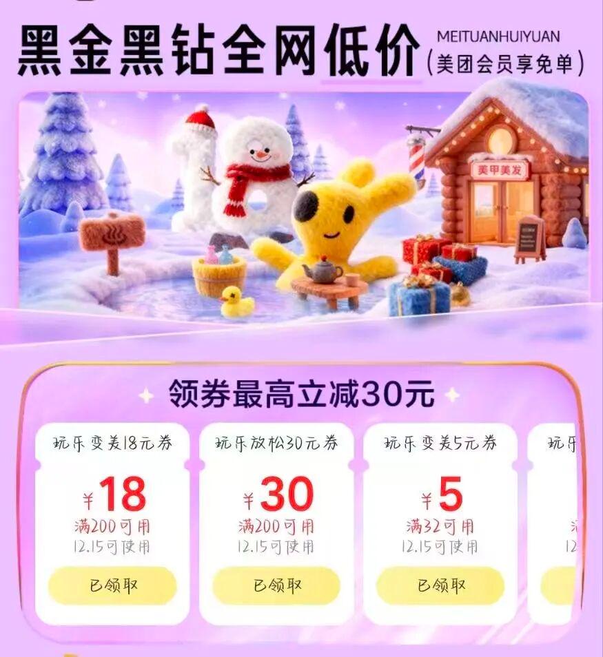 12月13日至12月18日,在美团App内搜索【会员专属价】黑金黑钻会员可领取所有品类大额神券,最高立减30元!
