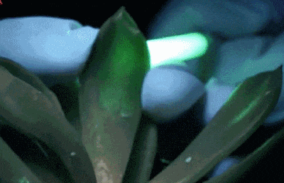 这些怪东西是一项来自华南农业大学的科研成果[4]。研究者把微米级粒径的无机发光材料做成悬浮液,然后将它注射到了多肉植物的叶片中。结果,这些发光颗粒均匀地分布到了多肉叶片的细胞间隙当中,发光效果竟然相当不错。