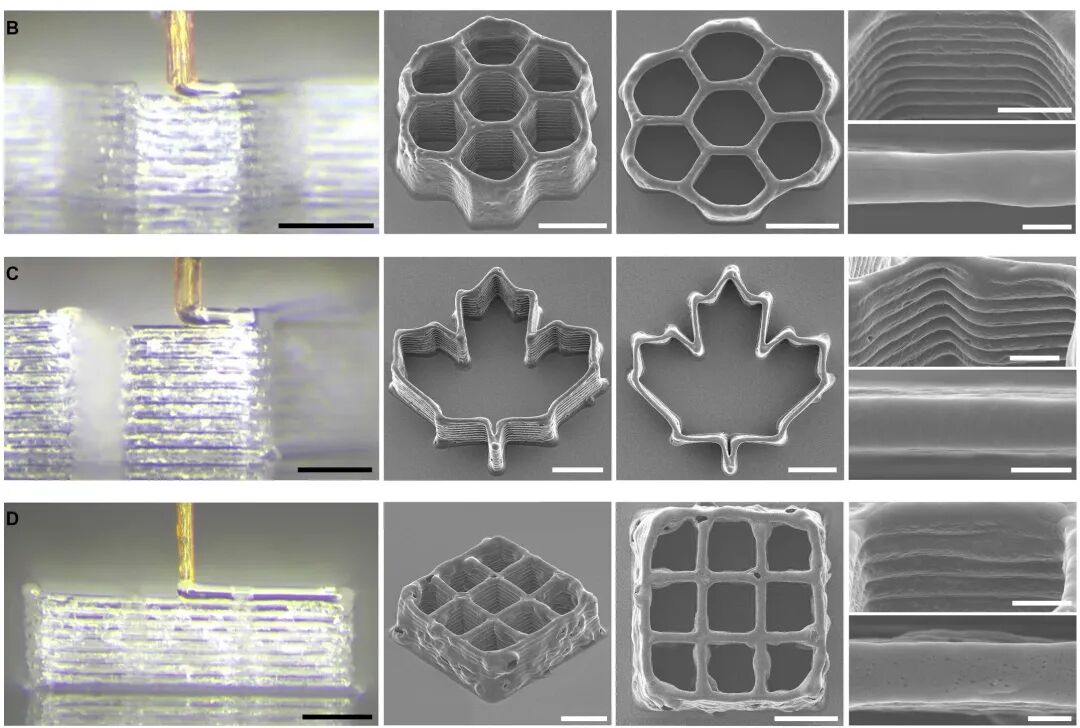 研究者将雌性蚊子的口器彻底消毒并剥去外层,涂上一层光固化树脂,然后再切掉两端,就得到了一根中空的“微型针管”。接下来,他们就把蚊子嘴针管连接到3D打印机上,用它挤出凝胶材料,打印了一系列精细的微型结构。