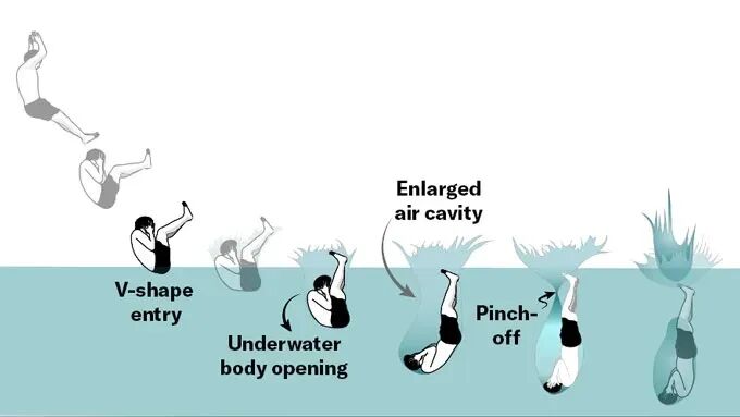 研究者发现,这项化身“泳池炸弹”的奇怪运动其实很有技术含量。要想砸出最高的水花,人们需要屁股朝下,以大约45°角的折叠姿势入水,然后再在准确的时机下迅速展开身体。这种跳水动作可以在水下制造较大的气体空腔,并在空腔收缩塌陷后形成高高溅起的沃辛顿射流。
