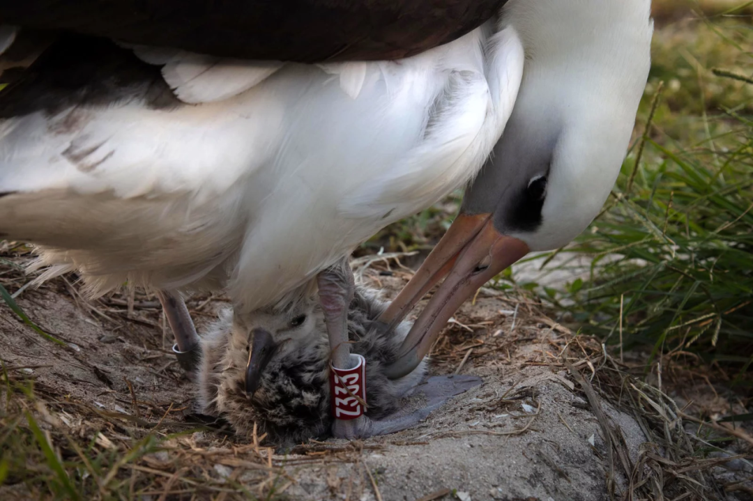 2011年,日本发生“3·11地震”并且引发巨大海啸,中途岛也受到波及,岛上11万只还不会飞行的信天翁雏鸟死亡。但或许是因为“智慧”的巢穴外有植被提供庇护,她的幼雏幸运地活了下来。前年,有人发现,当年的这只幸运儿现在已经在养育自己的幼雏了,这是“智慧”的孙辈。