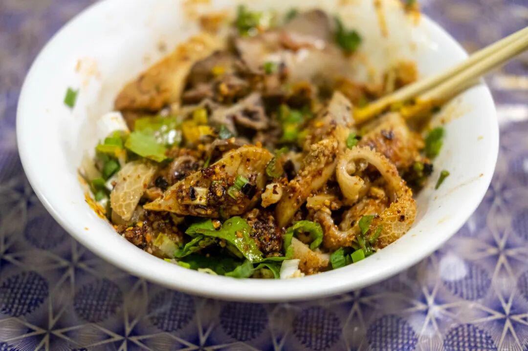 兰州传统的羊杂包括:羊心、羊肝、羊肺肚、羊肝、羊肠、还有羊头肉,将这些羊下水洗净后 放入自家秘制的料汤中进行烹煮,待煮好后将其切成块,配以蒜、醋汁调味后,便成了兰州传统的硬核街头小吃——干拌羊杂。