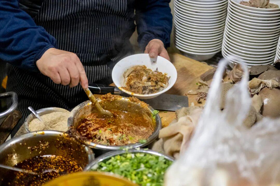 心、肝、肚、肺,每一块都有自己独特又浓郁的口感和气味,需要精准的火候和调味才能去腥留香。制作得当,内脏鲜嫩而不腥,汤汁浓厚却不油腻,羊香、葱香、辣香在口中交融,每一口都是复杂而饱满的层次感;稍有差池,味道就会跑偏,让不习惯的人敬而远之。