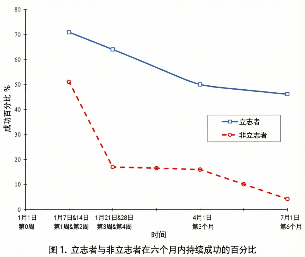 因为如果对比同样渴望改变却决定“顺其自然”、拒绝立志的人,6 个月后,这群“非立志者”里,只有 4%的人还在坚持 。