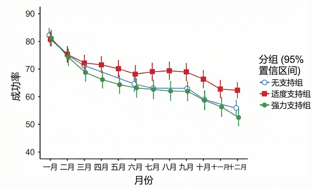 结果是,适度支持组的成功率最高(62.3%),显著高于无支持组(55.9%),而强力支持组的成功率竟然是最低的(52.5%) 。