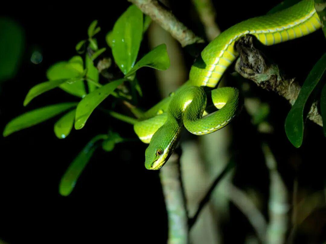 作为一个孤僻的独行侠,基本上除了繁殖季,海岛竹叶青不是在静静地埋伏猎物,就是在静静地消化猎物。作为伏击蛇类,竹叶青类成员以伪装和静止不动作为它们防御的第一计,是玩儿“一二三木头人”的老手。如果被发现和惊扰,它们会“恼羞成怒”,转而变得极具攻击性。
