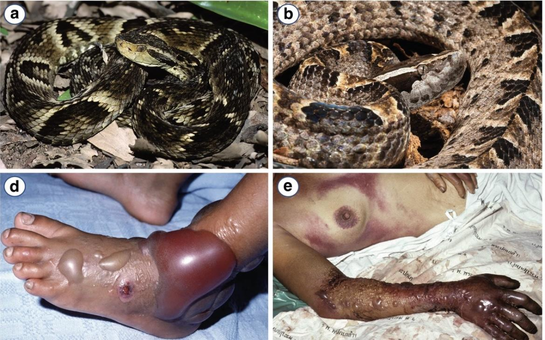 (a)矛头蝮(Bothrops jararaca);(b)马来蝮(Calloselasma rhodostoma)都是血循毒造成的咬伤丨David A. Warrell / Communications Biology