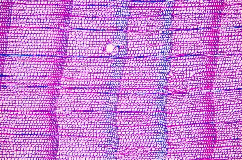 在那三年寒潮里,西班牙比利牛斯山脉上的树木过得异常艰难。因为夏天太过凉爽,甚至带着寒意,树木的细胞没能长好。原本应该坚硬厚实的细胞壁变得扭曲、脆弱,无法完成正常的木质化,在年轮中留下了两圈“蓝环”。