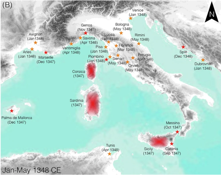 随着火山灰和气溶胶的升空,西地中海沿岸的国家迎来了凉爽的夏天。从1345到1347,连续三年,这里夏天的气温都比往年低了大约1℃。