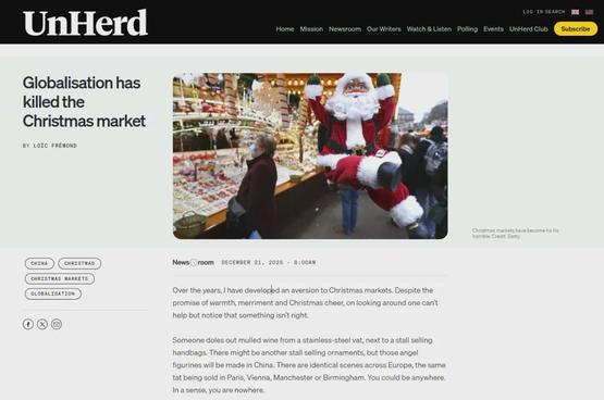 最近,英国媒体Unherd就发表了一篇名为《全球化杀死了圣诞市场》的文章,直指中国制造对欧洲传统手工艺的巨大冲击。