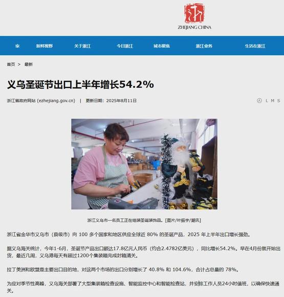 事实上,早在去年11月,《中国日报》就曾引述据行业统计数据,指出义乌作为“圣诞老人第二故乡”,是全球最大圣诞产品生产和分销枢纽,负责全球圣诞季近80%的商品供应。