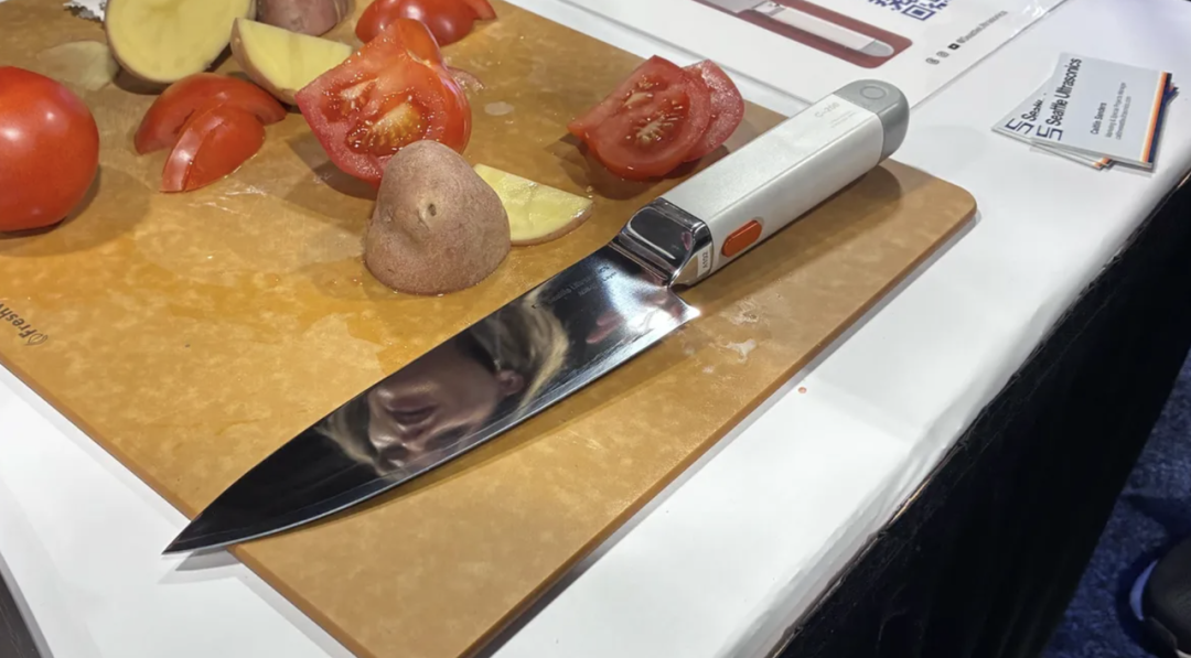 这把菜刀来自我的老家西雅图,售价399美元。 用的时候按一下刀柄上的按钮,刀就会进入超声波模式,发出每秒超过3万次的超声波脉冲。超声波模式下,刀尖能更精准更不费力地切开西红柿这种软软的食材,还能让土豆这种淀粉含量高容易粘在刀上的东西更容易脱落。开启后刀身并没有明显的震动,但能听到轻微的嗡嗡声。