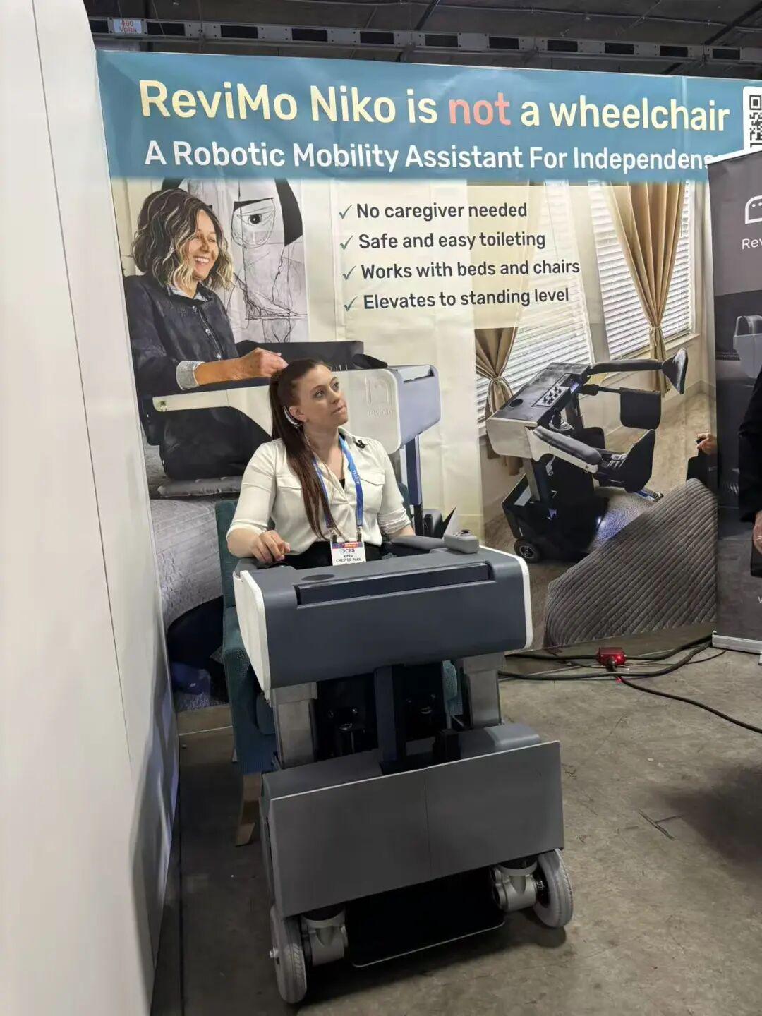 7)ReviMo Niko升降轮椅这个轮椅解决了拿东西和上厕所两个痛点,使用者再也不用反复起立坐下。轮椅屁股下面的凳子像两把勺子一样,可以从两边合拢,把人从床上挖起来,同理上厕所的时候可以把人放在马桶上。而且这个轮椅可以用遥控器操作,不需要喊护理人员把轮椅推走再推过来,座椅还能抬升到接近站立的高度,用于康复训练或取高处物品。它配有后视摄像头、安全传感器和报警按钮,核心目标只有一个:让使用者能安全、独立、有尊严地完成这些日常动作。