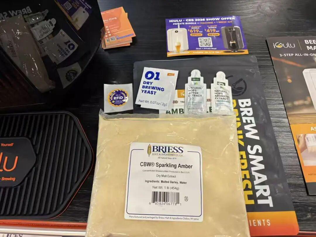 如果不想自己费心搞,还可以买他们配好的原料包,里面有大麦、酵母、啤酒花萃取物之类的。把酿造工具包和纯净水加入发酵桶中,扫一下RFID标签就可以启动发酵了。