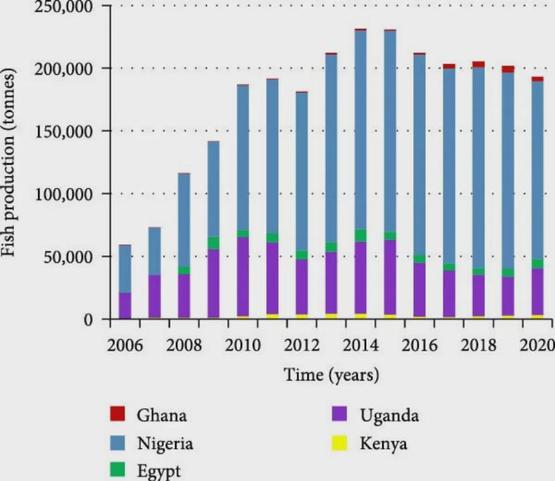 2006-2020年间,非洲五个主要养殖国(尼日利亚、乌干达、加纳、埃及和肯尼亚)的尖齿胡鲶年产量。 总产量在2014-2015年左右达到峰值(约23万吨),此后呈下降趋势丨参考文献[2]