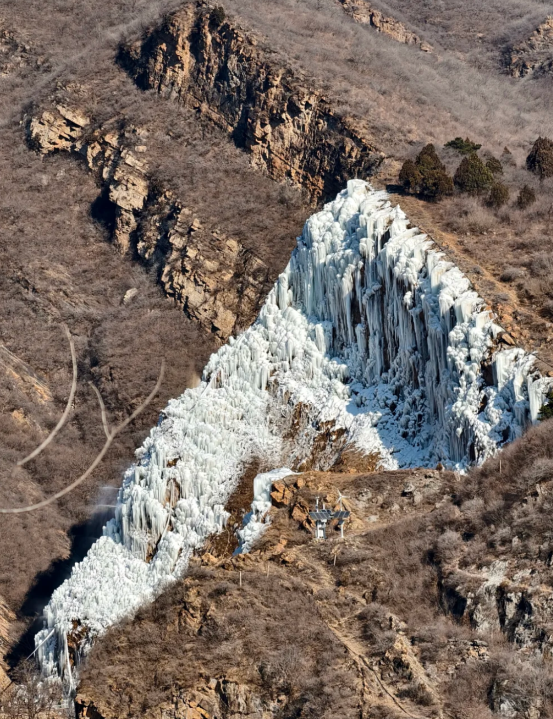 被称为“华北攀冰首选地”的云蒙峡冰瀑,原身其实是一个十多米高的土石坡。从停车场走向冰瀑时,可以看到一根白色的水管通向冰瀑顶。每天晚上4点,一位当地村子里的大爷会准时来赶走攀冰的人。5点,大爷会开水管放水,夜里水就会凝结成新的冰。“如果不浇水,每天那么多人凿,几天冰不就没有了”,大爷解释。