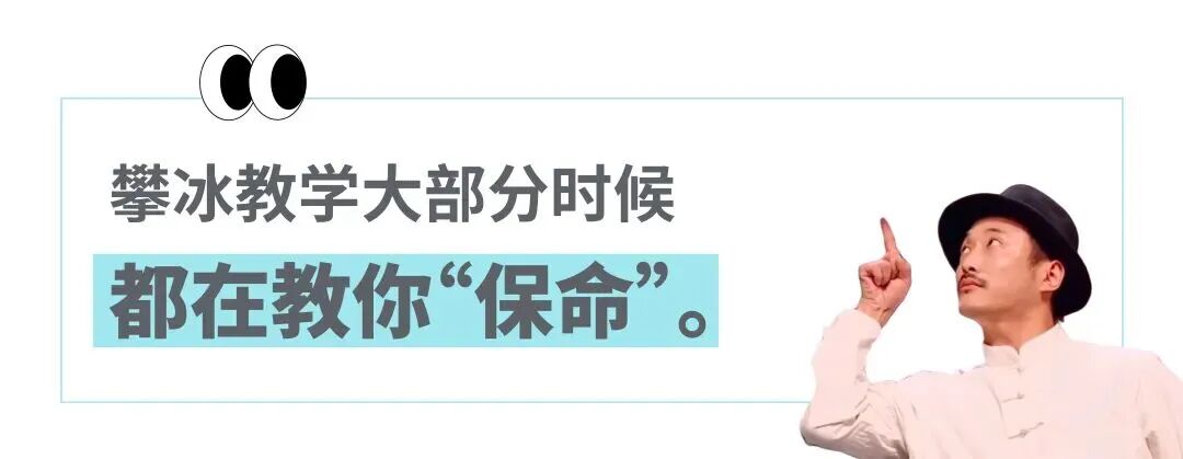 “简化后”的攀冰依然具有很强的风险性,这是一项需要你将尖锐的冰镐刺进冰里后,拉扯着自己向上攀爬的运动。因此,攀冰教学大部分时候都在教你“保命”。比如,敲冰后要迅速低头,用头盔抵御尖利的落冰。面对落冰,人的本能是转过头,但这在攀冰时是要避免的,因为转过头可能只会从划伤脸变成划伤耳朵。对体验者来说,攀冰的风险在方方面面:你可能在穿冰爪时被划伤手;在敲镐时被落冰砸到;下降时身体撞上凹凸不平的冰面;或是踢冰时用力过猛把脚踢到淤青。曾经有攀冰者在下降时撞到冰壁,不慎把左手的冰镐刺入了大腿。
