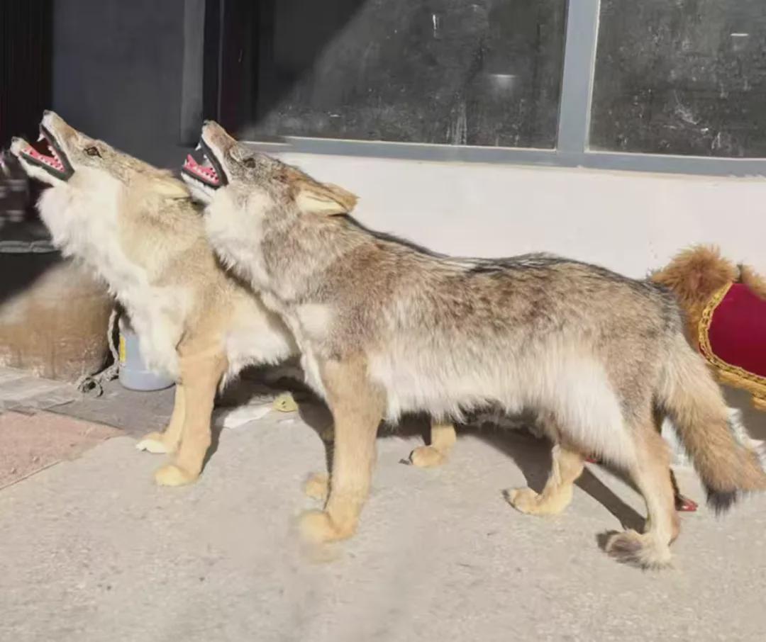 国内厂家生产的这种“仿真狼标本”,背部用的同样是郊狼皮,但由于进口至国内的郊狼皮大多为经过修边处理的筒皮,因此这种标本四肢、下颌处会用人造毛填补。