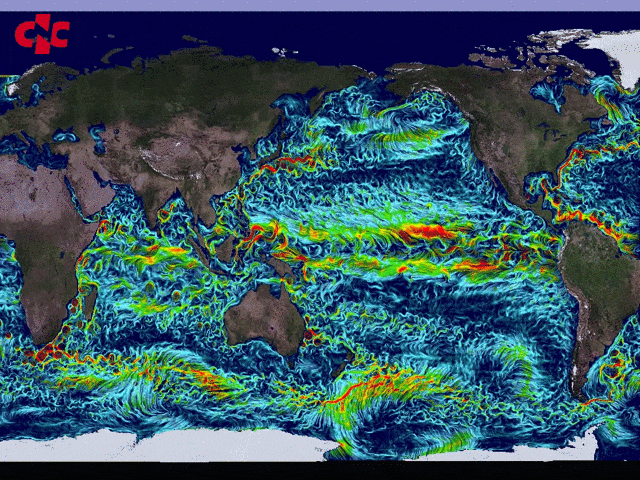 直到有了卫星,有了超级计算机之后,我们才得到了更准确高精度的模拟数据。将这些数据可视化可以让科学家直观地看到上图的画面,这对科学家来说是非常关键的,因为他们能清楚地看到洋流的速度、方向、温度变化情况。