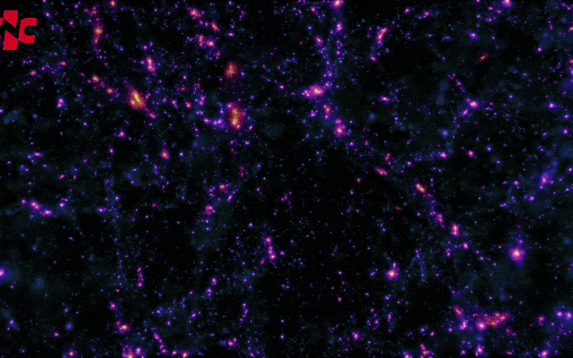 这些星系经历了140亿年的穿行,形成现在的各种星系团结构,这些星团之间有一些丝状结构的连接在一起,也许左下角飞过的小亮点就是我们的地球。