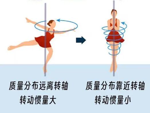 在快速旋转时,运动员总是会把手臂和双腿向内收紧,这是为了减少转动惯量。转动惯量是一个描述物体旋转惯性大小的物理量,它由物体的质量和质量的分布方式决定。在收紧四肢时,运动员的各部分质量都很靠近旋转轴,此时转动惯量就会减小;如果向外舒展肢体,四肢质量分布在远离旋转轴的地方,转动惯量就会变大。